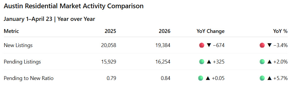 Austin residential (Jan 1–Apr 21): new listings are down 2.7% YoY, pending contracts are up 2.2% YoY, and absorption has improved to 0.84. Buyer demand continues to outpace supply compared to last year as spring momentum builds.